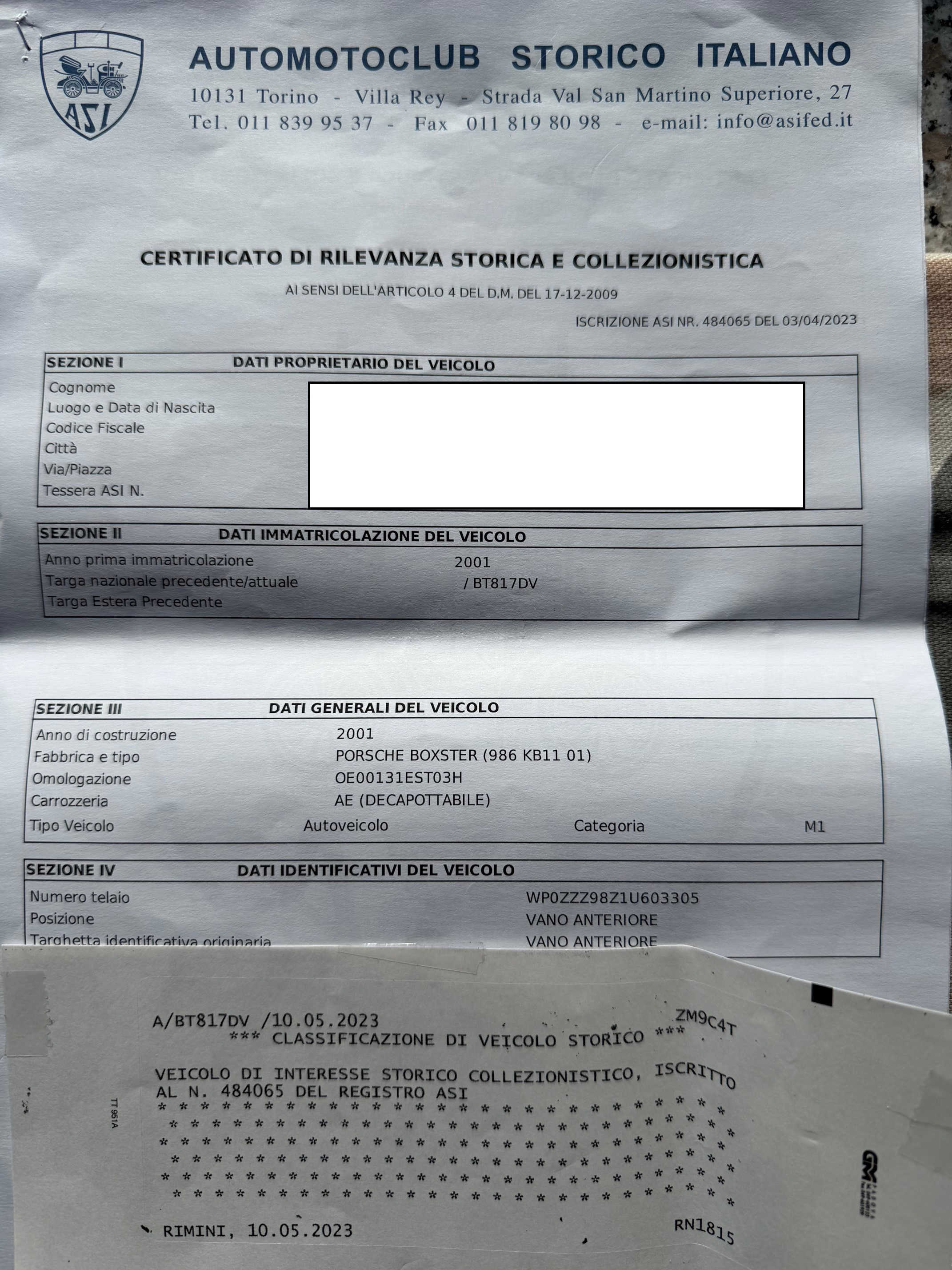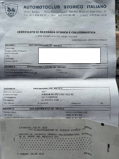 VETTURA DI INTERESSE STORICO ISCRITTA "ASI"